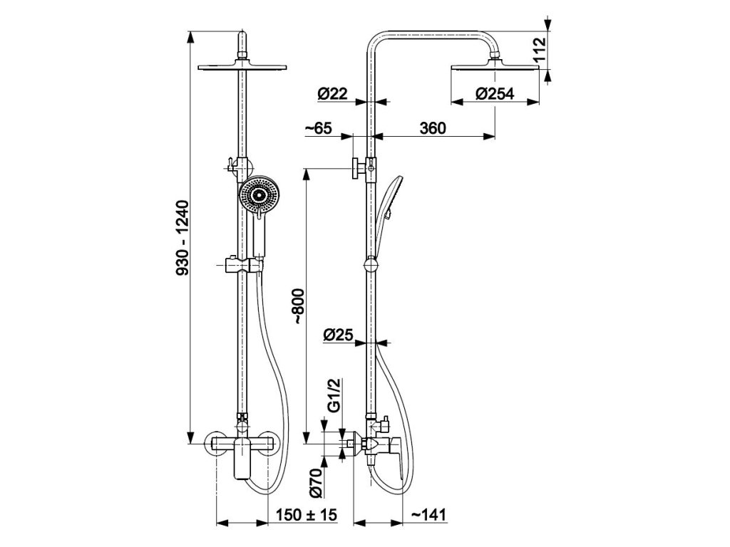Batéria s keramickým sprchovým spínačom, sprchová tyč, kĺbový disk, ručná sprcha s rukoväťou, montážna sada (etážky s tesneniami + kónické rozety - 2 ks, nástenná montáž na tyč - 1 ks), PVC sprchová hadica L = 1500 mm, montážny návod + záručný list